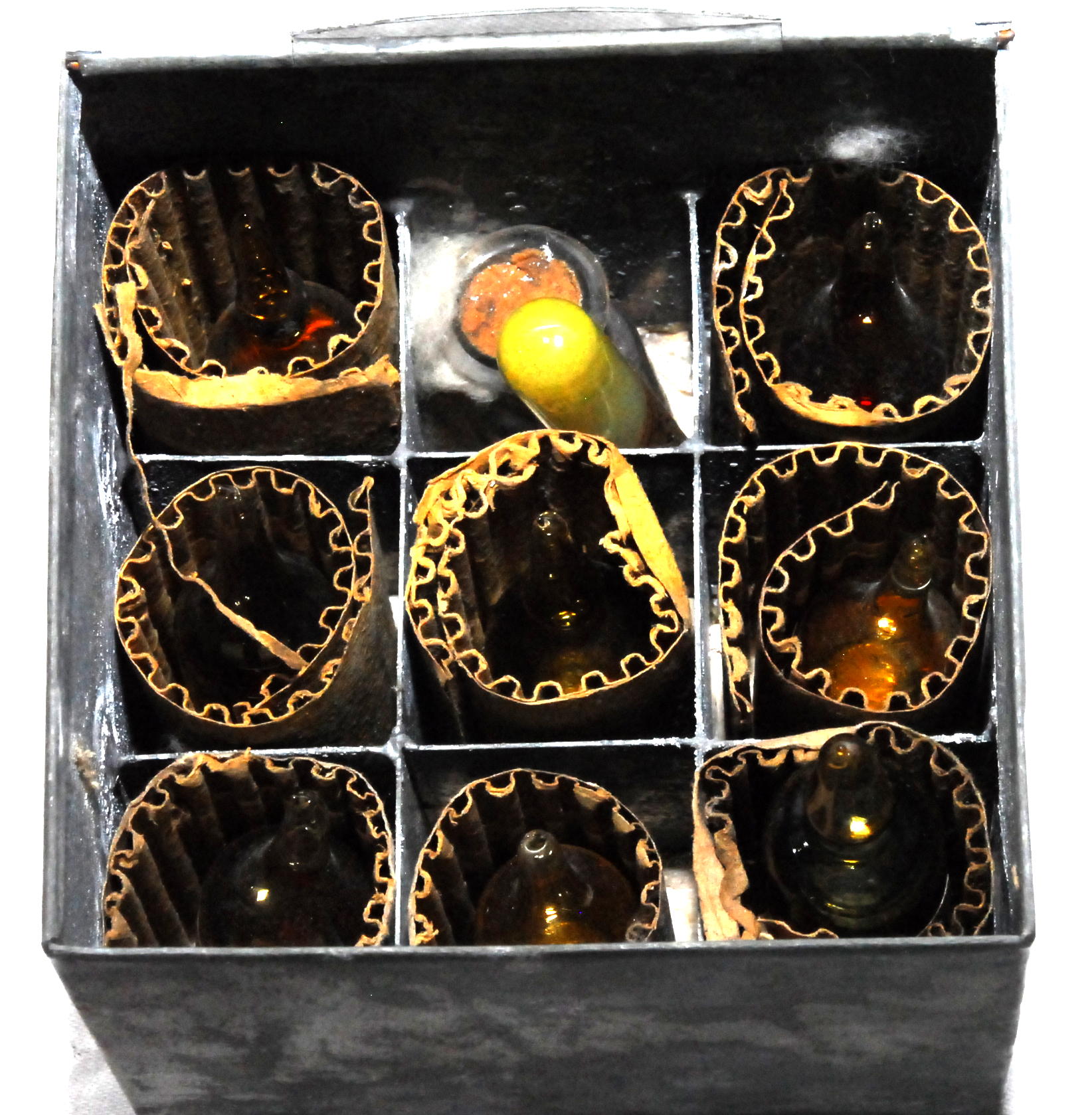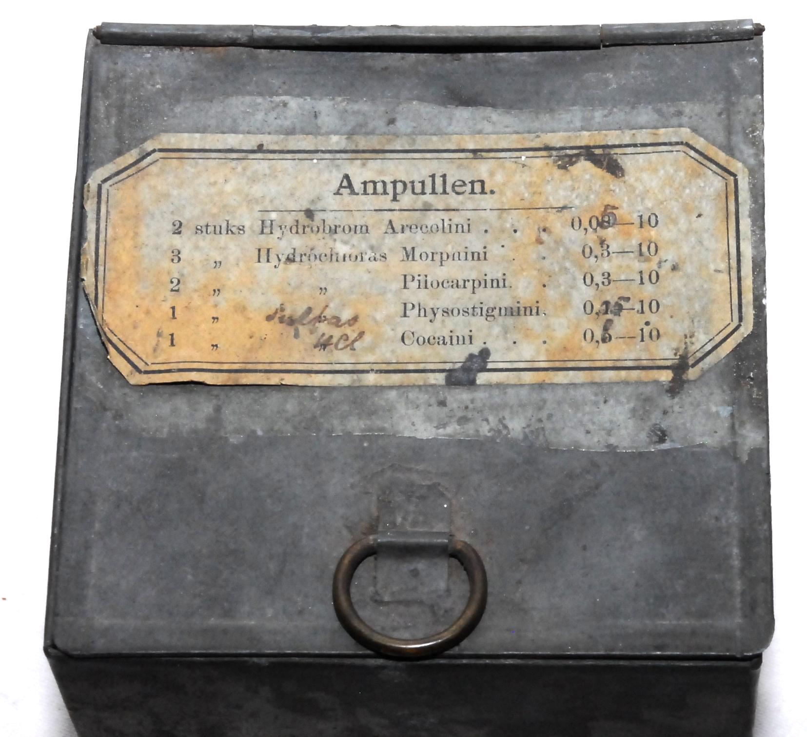 Palliativmedizinischer Notfallbehälter aus dem I. WK mit Ampullen: Hydrobrom Arecolini, Hydrochlor. Morphini, Hydrochlor. Pilocarpini, Hydrochlor. Cocaini, COLFIN Koliek Spezificum